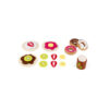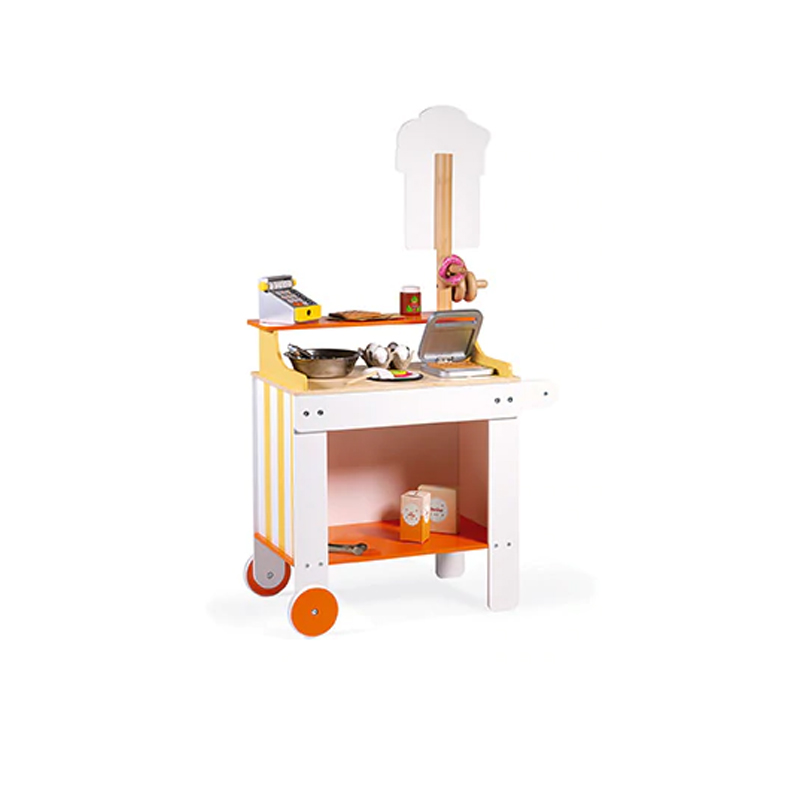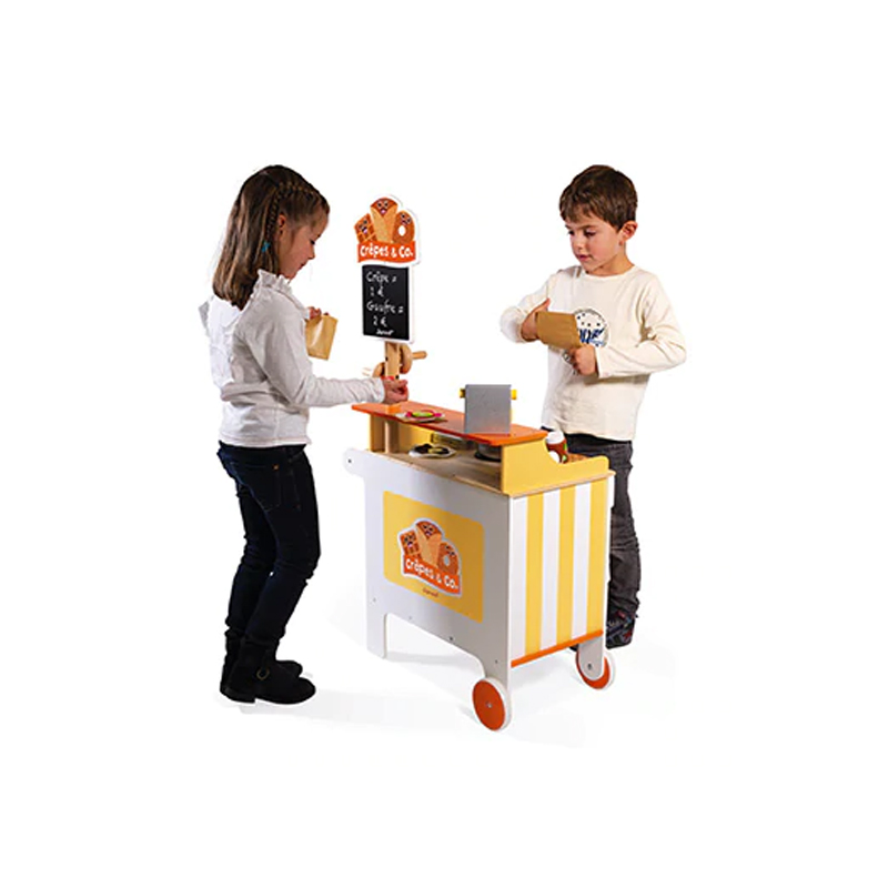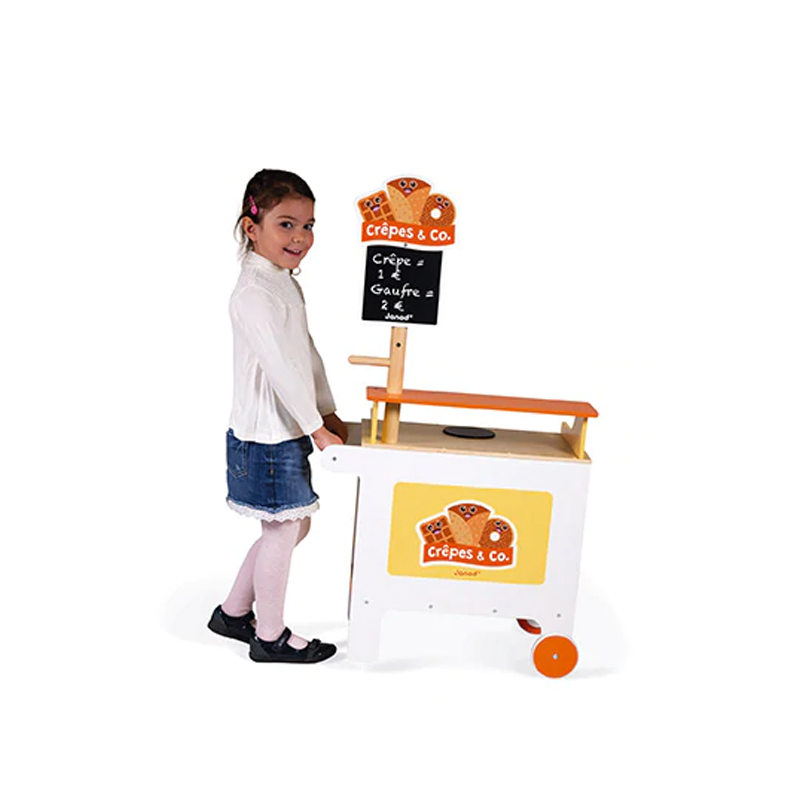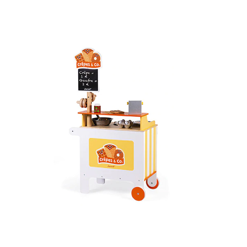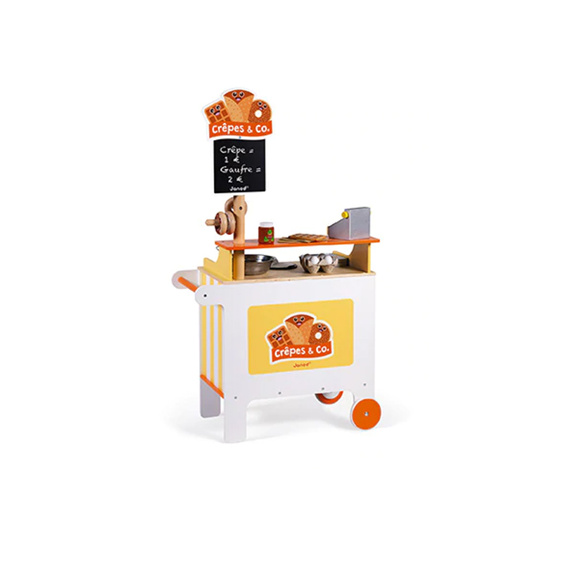 • 40 Accessories Included: 1 x Crepes & Co Waffle Stand, 1 x Cash Register With Coins And Notes, 1 x Waffle Iron, 3 x Waffles, 3 x Donuts, 1 x Carton Of 4 Eggs, 1 x Jar Of Spread, 3 x Crepes, 3 x Fillings For The Crepes, 1 x Bowl, 1 x Whisk, 1 x Crepe Rake, 9 x Pieces Of Sliced Fruit, 1 x Janod Pair Of Tongs, 3 x Paper Bags, 2 x Cardboard Food Boxes and a Box Of Chalk
